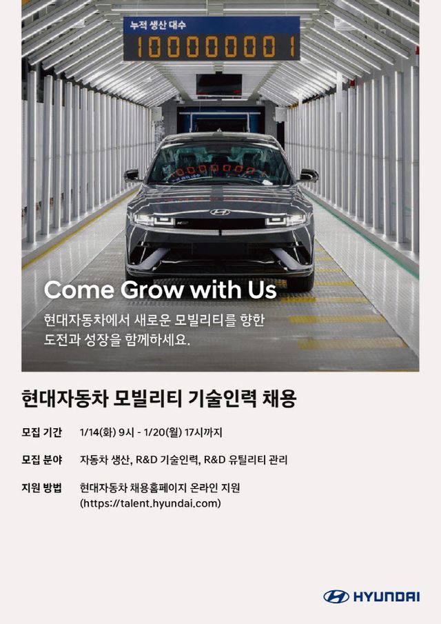 한편, 현대차는 오는 14일부터 20일까지 일주일동안 상반기 생산직 채용을 실시한다. 이번 채용에서는 △자동차 생산 △연구개발(R&D) 기술인력 △R&D 유틸리티 관리 등 3개 부문에서 인재를 모집하며, 지원자격은 고등학교 졸업 이상이다.