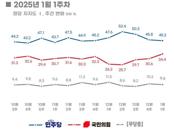 [폴리뉴스 김승훈 기자] 윤석열 대통령의 탄핵정국이 이어지고 있는 가운데 지난 주에 이어 국민의힘 정당 지지율이 상승하고 민주당은 하락하면서 양당 격차가 15.2%P에서 10.8%P까지 줄어들었다.