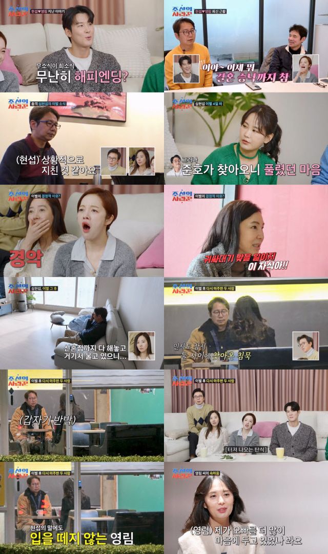 그러나 이틀 뒤, ‘싸운’ 차원이 아니라 ‘정말 끝났다’는 심현섭, 정영림의 이별 소식이 전해져 충격을 안겼다. 한숨도 못 잔 채 울산에서 서울로 올라온 심현섭은 수척한 모습으로 “영림이가 상황적으로 지친 것 같다”고 말했다. 최근 퍼진 가짜 뉴스들 탓에 영림의 어머니가 쓰러지셨고, 친척들마저도 “평범한 사람을 만나라”며 이들의 연애를 반대하고 나서 모두가 많이 지친 상황이었다. 이에 최성국, 황보라는 “어머니께서 쓰러지신 건 크다. 나 같아도 감당 못 할 것 같다”라며 씁쓸한 반응을 보였다.