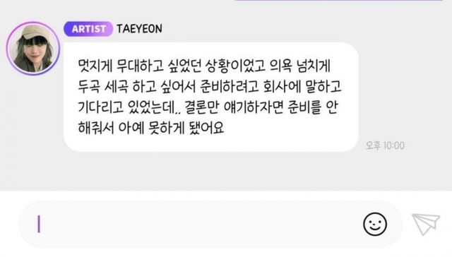 지난 6일 태연은 팬 소통 플랫폼 버블을 통해 “멋지게 무대하고 싶었던 상황이었고 의욕 넘치게 2~3곡 하고 싶어 회사에 말하고 기다렸다”고 말했다.