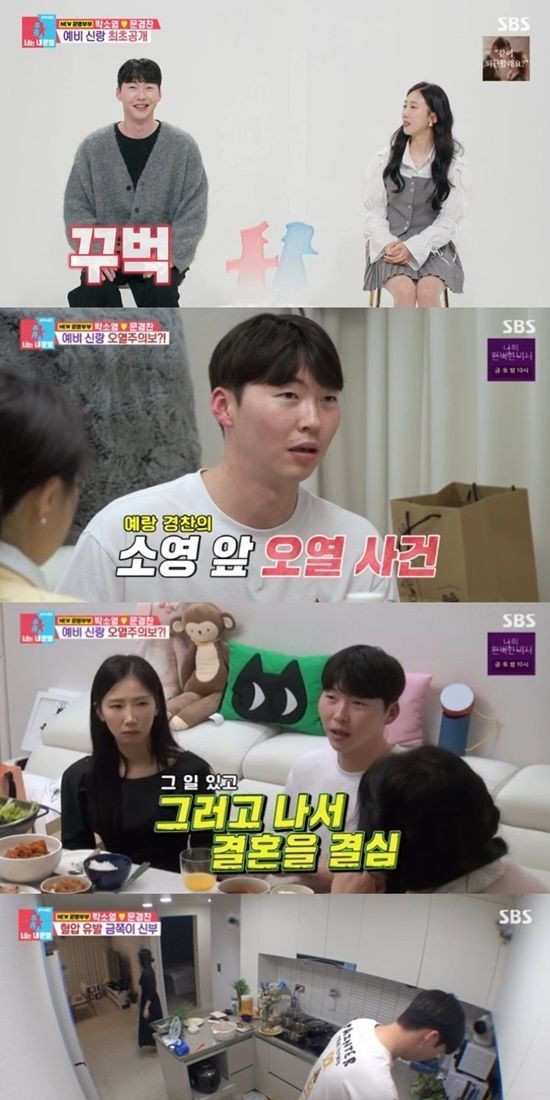 한편, 박소영은 "남편이 내 이상형이다. 제일 좋은 건 계속 웃는다. 남편이 선수 시절에 늘 긴장감 속에 살지 않았냐. 저를 만나면 걱정이 없어진다고 하더라"며 여전히 반한 모습을 보였고, 문경찬은 "저는 소영 씨 앞에서 울어본 적이 있다. 은퇴 후에 그냥 시간만 흘러가는 게 힘들었다. 그런데 소영 씨가 다 받아주더라. 저를 안아 주려고 하는 느낌을 받았고 그 이후에 결혼을 결심했다“고 덧붙였다. 이에 박소영은 "내가 먹여 살릴 테니까 즐겁게 일하라고 했다"고 말해 ‘연상 아내’의 남다른 면모를 보였다.