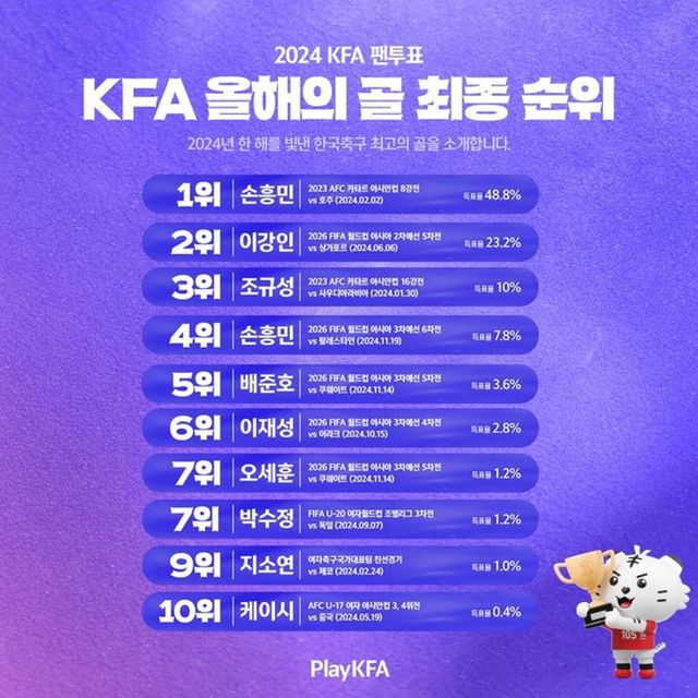 지난 6일 연합뉴스 보도에 따르면 축구협회는 이날 홈페이지를 통해 팬들이 직접 뽑은 '2024 KFA 올해의 골'과 '2024 KFA 올해의 경기' 투표 결과를 발표했다. 해당 투표는 축구협회 마케팅 플랫폼 'PlayKFA'에서 지난달 5~26일까지 진행됐으며 2607명이 참가했다.