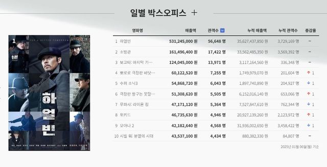 7일 영화진흥위원회 영화관입장권통합전산망의 집계에 따르면, ‘하얼빈’은 전날 5만 6643명의 관객을 동원해 누적 관객수 372만 9164명을 기록했다.