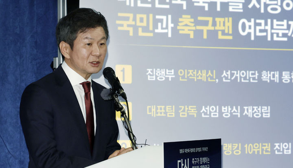 정 회장은 이런 부정 여론에도 불구하고 ▲집행부 인적쇄신, 선거인단 확대 통한 지배구조 혁신 ▲대표팀 감독 선임 방식 재정립 ▲남녀 대표팀 FIFA 랭킹 10위권 진입 ▲2031 아시안컵·2035 여자월드컵 유치 ▲K리그 운영 활성화 위한 글로벌 스탠다드 규정 준수 및 협력 관계 구축 ▲시도협회 지역축구대회 활성화 및 공동 마케팅 통한 수익 증대 ▲국제심판 양성 및 심판 수당 현실화 ▲우수선수 해외 진출을 위한 유럽 진출 센터 설치·트라이아웃 개최 ▲여자축구 활성화 위한 프로/아마추어 통합 FA컵 개최 ▲유소년·동호인 축구 저변확대, 지도자 전문 교육 프로그램 지원 ▲축구인 권리 강화 및 일자리 창출 ▲축구 현장과의 소통강화 및 인재 발탁 등 12가지 공약을 제시하면서 4선에 도전장을 내밀었다.