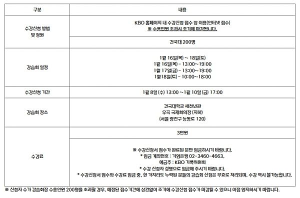 수강 정원은 200명으로 1월 8일(수) 오후 1시부터 10일(금) 오후 5시까지 KBO 홈페이지 수강신청 접수 창을 통해 선착순으로 접수를 마감한다. 기타 문의사항은 KBO 홈페이지 내 기록위원회 스코어링 필드, 1:1문의하기를 이용하면 된다.
