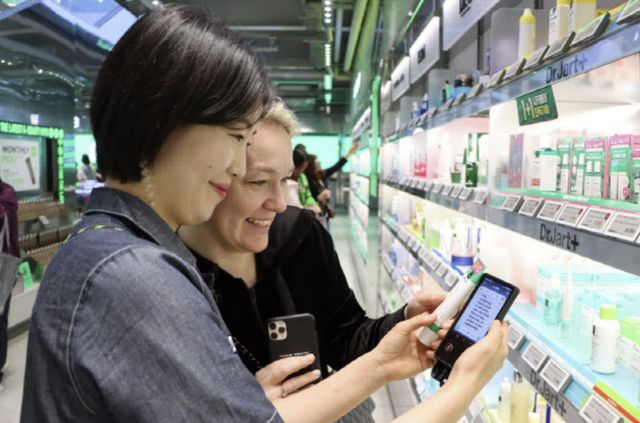올리브영 명동 타운 직원이 전국 매장에 도입된 휴대용 번역기를 활용해 외국인 고객을 응대하고 있다. (사진=CJ올리브영)