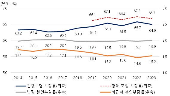 제증명 수수료와 같은 행정비용과 영양주사, 도수치료, 상급병실료 등 급여화 필요성이 낮은 항목을 제외하고 보장률을 산출하면 현재 건강보험 보장률(64.9%)보다 1.8%포인트 높은 66.7%가 된다. 하지만 여전히 전년(비필수항목 제외 시 67.3%)보다 낮다. 독감 주사제 등과 같은 비급여 본인부담률이 15.2%로 전년 대비 0.6%포인트 증가한 영향이 크다