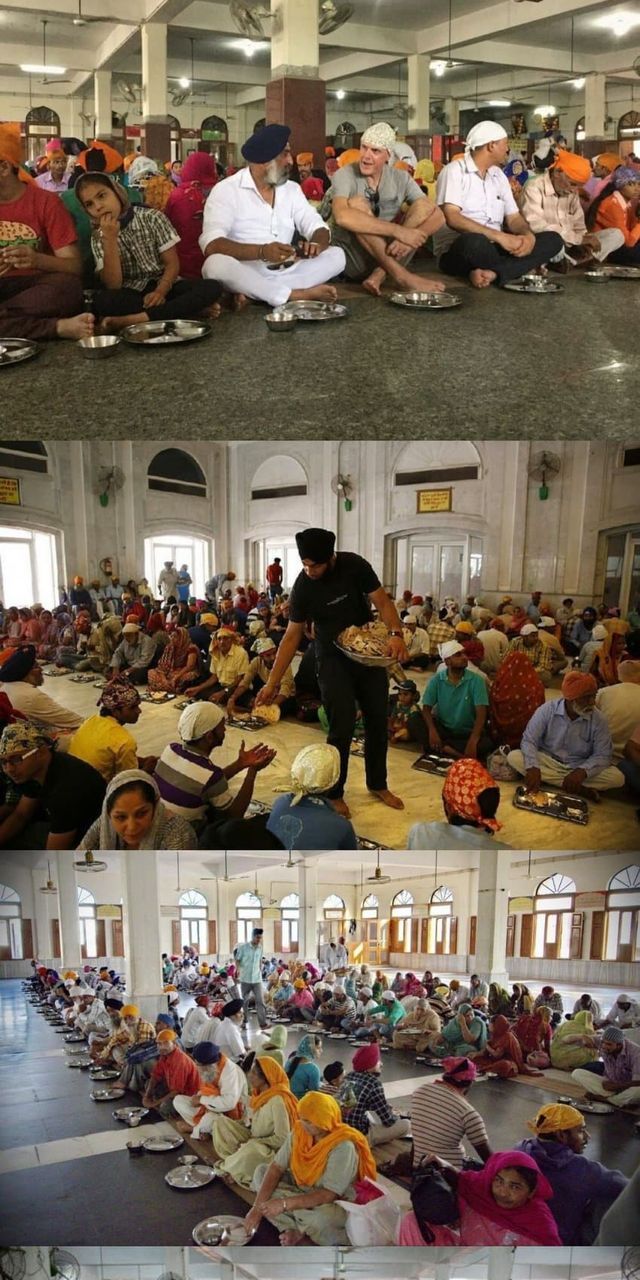 힌두교의 차별과 이슬람의 비합리성을 모두 타파한 종교인 시크교답게 인류의 평등을 보여주기 위해 나란히 앉아서 함께 밥을 먹는다고 함