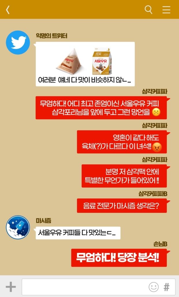 인터넷에는 ‘서울우유 커피 삼각포리’를 두고 한 가지 갑론을박이 벌어진다. 바로 서울우유에서 만든 커피에는 재료가 유사하기 때문에 맛은 같다는 주장이다.