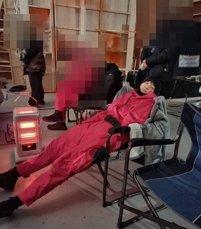박규영은 이날 자신의 인스타그램 스토리에 ‘오징어게임’ 촬영 현장을 올렸다. 사진 속 박규영은 의자에 기대어 앉아 휴식을 취하고 있었다. 그러나 문제가 된 건 박규영 뒤에 함께 찍은 의문의 남성 배우.