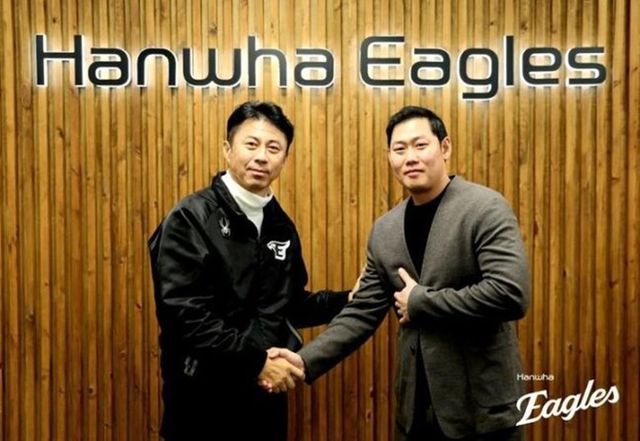 한화와 FA 계약을 체결한 하주석이 손혁 단장과 악수를 나누고 있다. / 한화 이글스