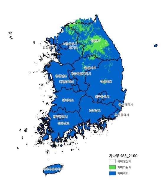 SSP5-8.5 기후변화 시나리오를 적용해 2100년까지 10년 단위로 재배 적지를 예측한 결과, 녹차용 차나무 재배 지역은 급속히 증가함을 알 수 있었다. 올리브 재배 적지도 속도는 느리지만 꾸준히 확대되는 것으로 분석됐다.