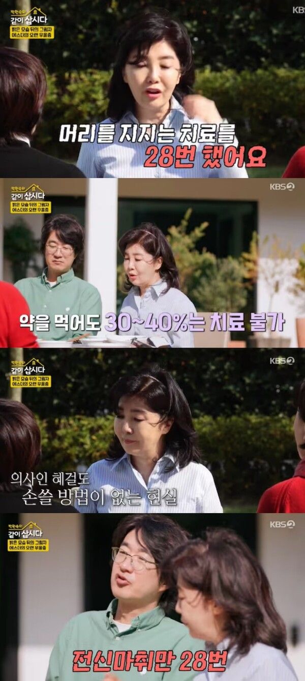 여에스더는 이를 이어받아 “약을 먹어도 30~40%의 증상만 완화될 뿐이다. 난치성 우울증으로 전기 경련 치료를 28번 받았다”고 털어놓았다.