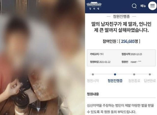 A씨는 2020년 연말 청와대 국민청원 게시판에 “가해자는 도피하며 PC방에서 태연하게 제 딸의 돈으로 게임을 즐기고 게임 소액결제까지 하면서 살인을 저지른 사람이 할 수 없는 대범함을 보였다”며 “지금은 반성문을 내는 건 어떻게든 형을 줄이려는 것”이라고 목소리를 높였다.
