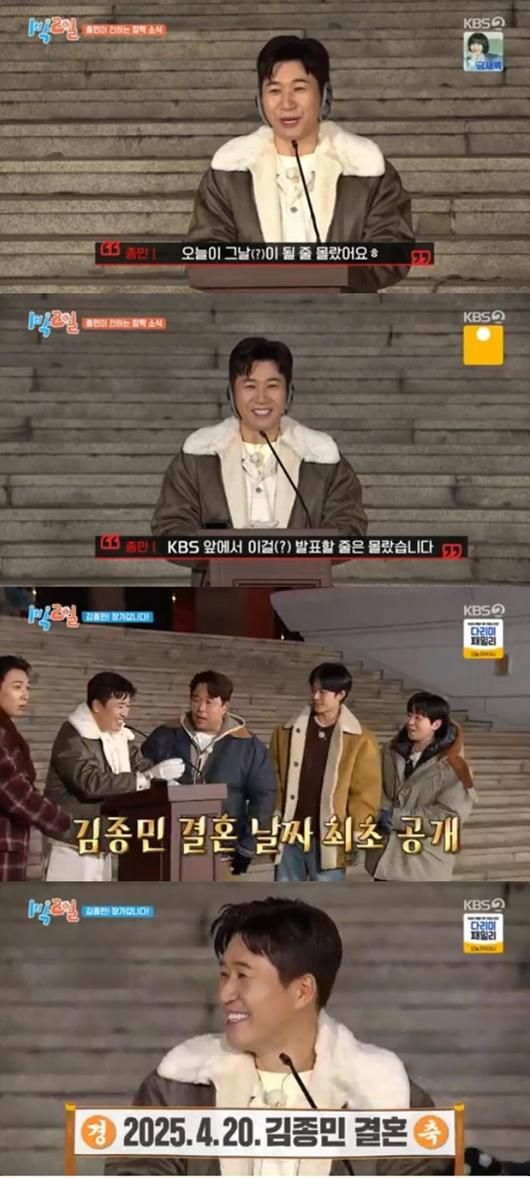 12일 방송된 '1박 2일'에서는 김종민이 결혼식 날짜를 최초로 공개하는 모습이 그려졌다. 이날 김종민은 KBS 본관 앞에서 중대 발표를 앞두고 긴장한 모습을 보였다. 그는 “긴장된다기보다 믿기지 않는다. 오늘이 그날이 될 줄 몰랐다”며 떨리는 심정을 드러냈다.