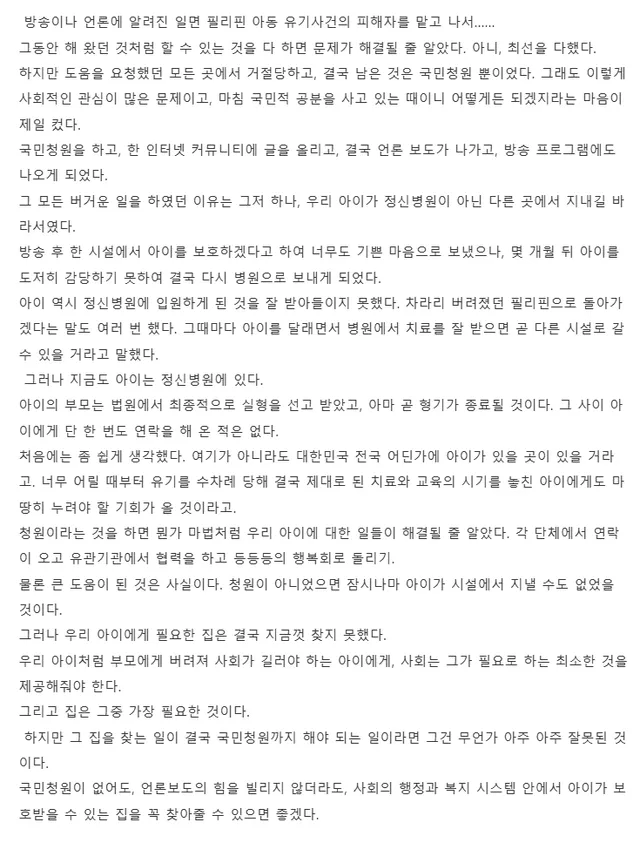 피해자는 다시 병원에 입원하게 된 상황을 잘 받아들이지 못했고 차라리 버려졌던 필리핀으로 돌아가겠다, 병원에서 나갈 수 있다면 부모님 집도 괜찮다고 할 지경이었다.