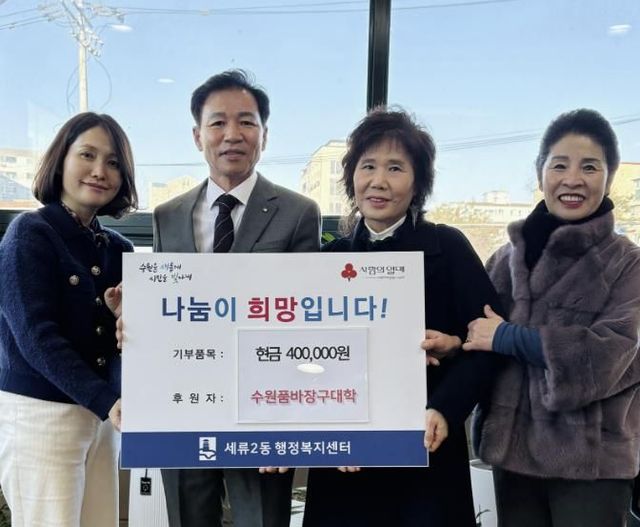 [와이뉴스] 수원품바장구대학은 지난 10일 설명절을 앞두고 이웃돕기 성금 40만원을 권선구 세류2동 행정복지센터에 전달했다.