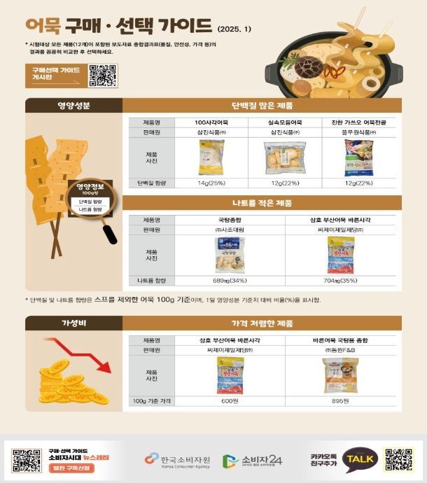 `진한 가쓰오 어묵전골(모듬어묵, 풀무원식품㈜)'이 100g 기준 1,479원으로 가장 비쌌고, `삼호 부산어묵 바른사각(사각어묵, 씨제이제일제당㈜)'이 600원으로 가장 저렴했다.