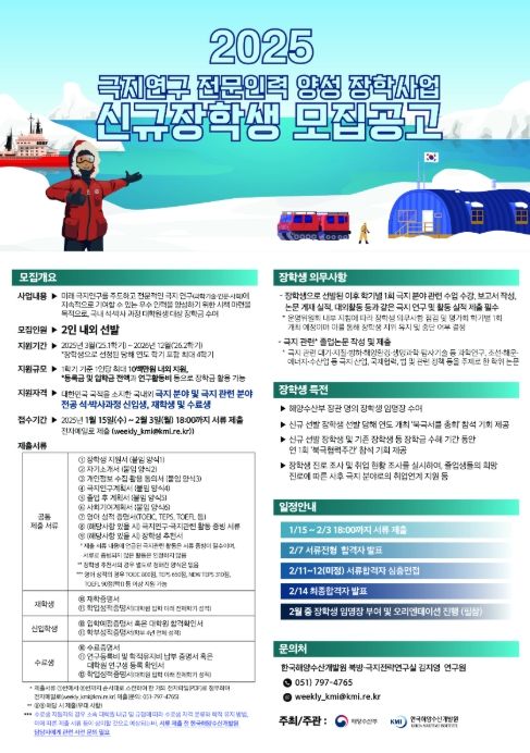 [파이낸셜경제=김영란 기자] 해양수산부는 1월 15일부터 2월 3일까지 대한민국 국적의 극지 관련 분야 전공 석·박사과정생을 대상으로 ‘제3차 극지연구 전문인력 양성 장학사업’의 장학생을 모집한다.
