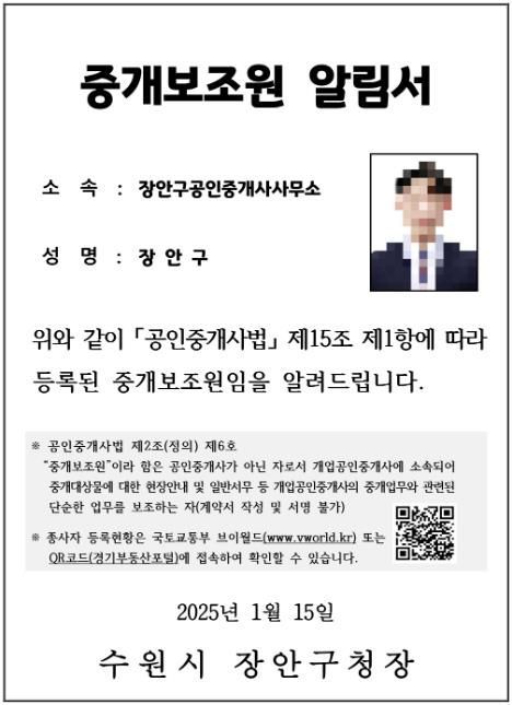 이에 장안구는 관내 등록된 511개 중개업소 중 중개보조원을 고용 중인 162개 업소(32%), 188명의 중개보조원을 대상으로 실명제를 추진한다. 이를 위해 중개보조원의 소속, 이름, 사진을 포함한 ‘중개보조원 알림서’를 구청에서 자체 제작해 해당 중개업소에 제공할 예정이다.