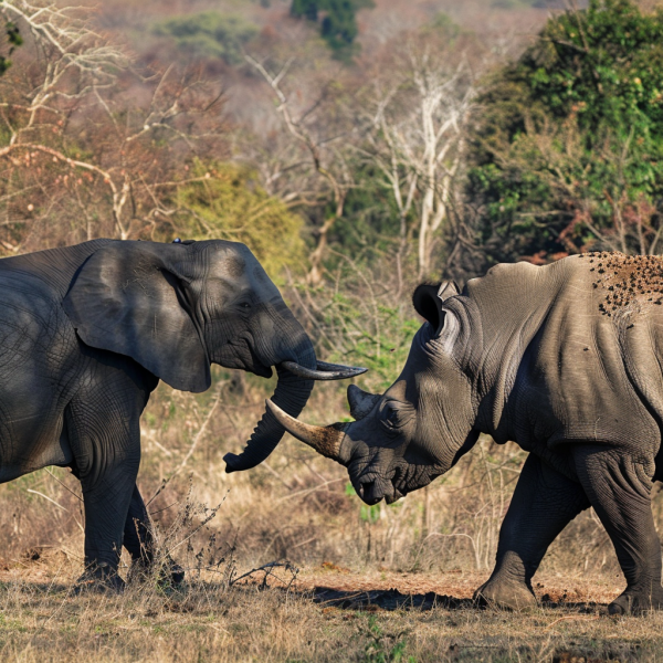 코끼리와 코뿔소는 아프리카와 아시아의 대표적인 생태계 거물로, 힘과 전략에서 각기 다른 장점을 보유하고 있음.