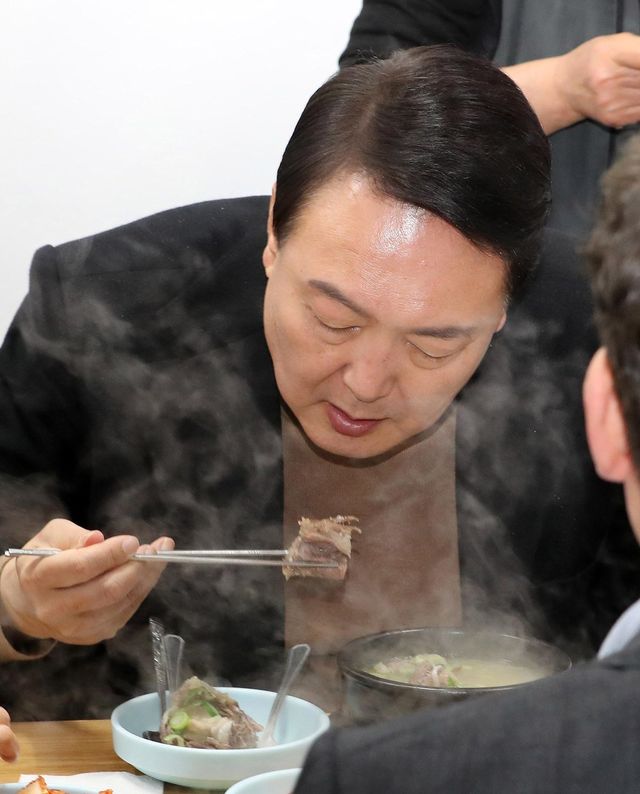 윤석열 대통령이 당선인 신분이던 2022년 3월 14일 서울 남대문 시장을 찾아 식당에서 식사하고 있다. / 뉴스1