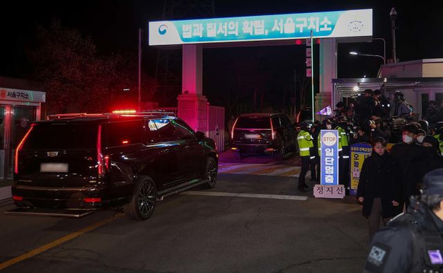 내란 우두머리 혐의로 체포된 윤석열 대통령이 15일 고위공직자범죄수사처(공수처)의 수사를 마친 후 경기도 의왕시 서울구치소에 도착하고 있다. / 뉴스1(공동취재)