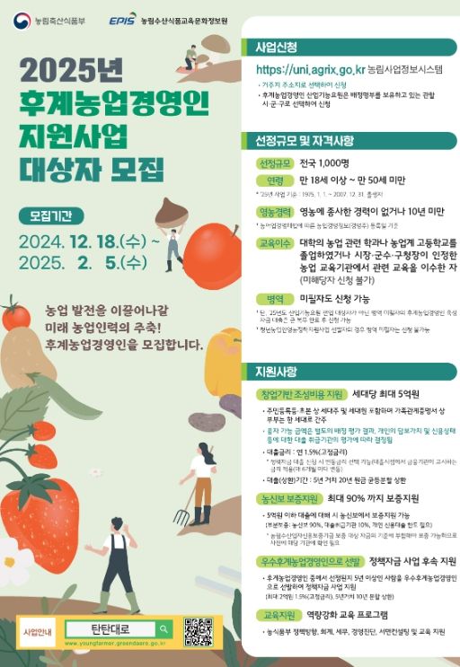 후계농업경영인 지원사업 대상자는 만18세 이상 만50세 미만(25년 사업기준 1975.1.1 부터 2007.12.31 출생자)의 독립경영 10년 미만(독립경영 예정자 포함)인 자로, 선정 후 5년까지 세대당 최대 5억 원의 정책자금을 지원받을 수 있다.