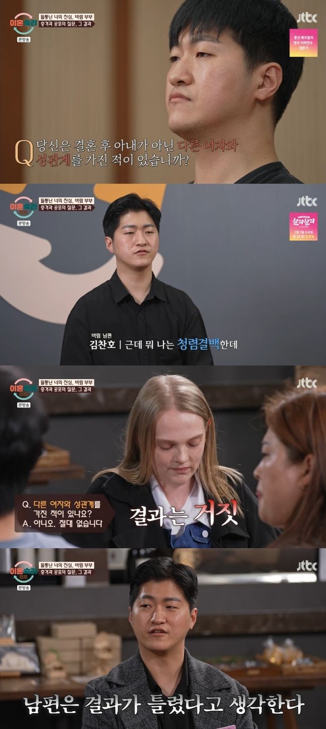 바람 아내는 "6년의 시간을 믿고 싶다"는 마음을 내비쳤으나 하지만 다른 여성과 성관계를 가진 적 없다는 답의 결과는 '거짓'이었다.