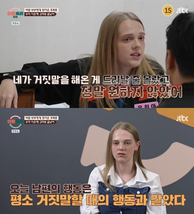 "거짓이라고 나왔을 때 바로 내게 무릎을 꿇었어야지"란 아내의 말에 남편은 "지금 네 기분에 맞추겠다"며 무릎을 꿇었다. 아내는 "넌 6년 간 거짓말 안했다고 하는데 네 거짓말이 이렇게 드러나길 원치 않았다"고 울분을 토했다.
