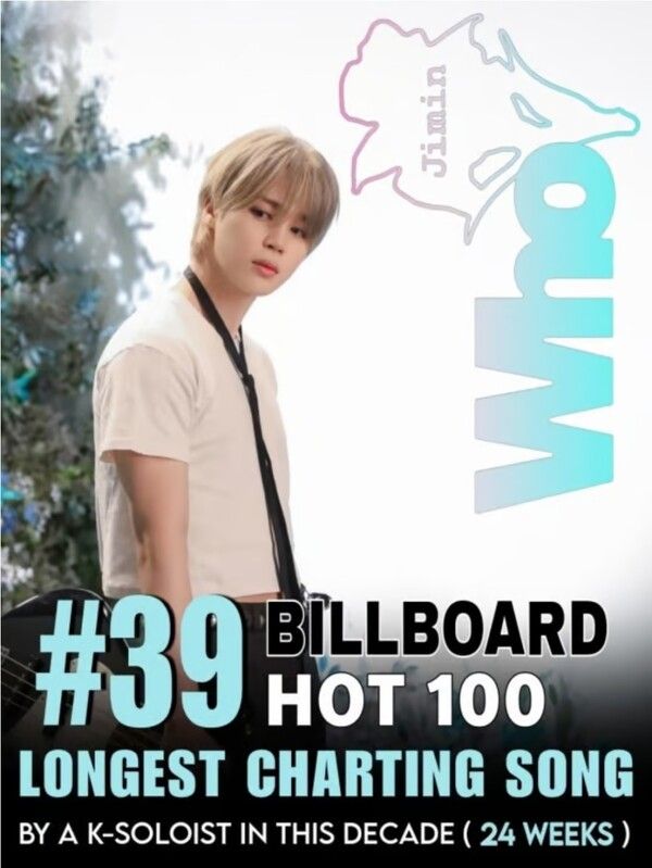 14일(현지시간) 발표된 빌보드 최신 차트에 따르면, 지민의 솔로 앨범 'MUSE'의 타이틀곡 'Who'가 '핫 100' 차트 39위에 재진입하며 24주 연속 차트인이라는 기록을 세웠다. 이는 싸이의 '강남스타일' 이후 K팝 솔로 아티스트가 '핫 100' 차트에 가장 오랫동안 머문 기록이다.