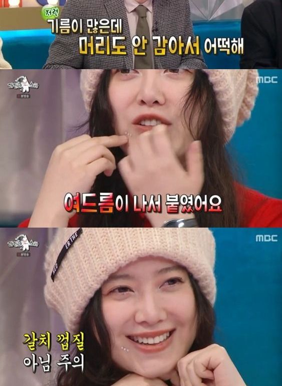 김구라는 "기름도 많은데 머리를 안 감으면 어떻게 해"라고 걱정했고 구혜선은 "PD님이 모자를 벗고 촬영하는 게 좋겠다고 하는데 모자를 못 벗는 상황이라고 했다"라고 덧붙였다.