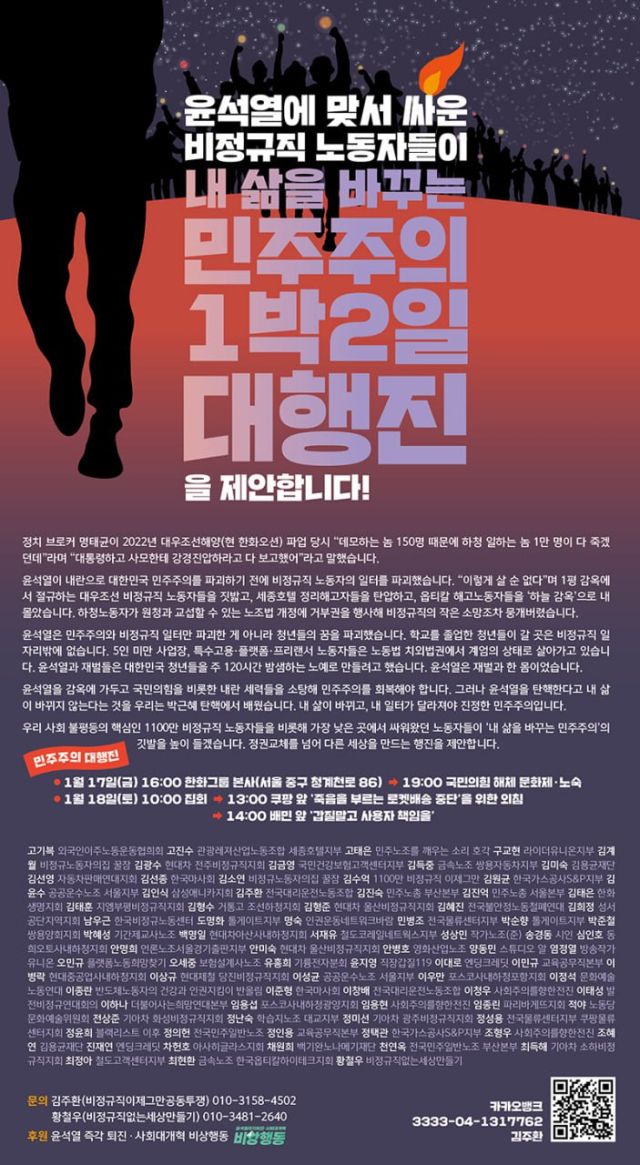 노동자들은 내란 이전부터 언제나 계엄상황에 있는 것이나 마찬가지였습니다. 헌법을 무시하고 노동조합을 인정하지 않으며 죽음으로 내몰기까지 하는 자본과 윤석열은 한 몸이었고 지금도 노동자들에게 민주주의는 없었습니다. 길거리에 내몰려 투쟁하는 노동자들의 문제를 해결하지 않고 그저 윤석열만을 탄핵한다고 내 삶이 바뀌지 않는다는 것을 우리는 박근혜 탄핵에서 배웠습니다.