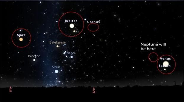 이날 보이는 6개의 행성의 위치를 연결하면 황도의 위치를 가늠할 수 있다. 차창이나 건물 창문으로 비스듬하게 들어오는 햇빛에 눈이 부신 경험을 떠올려 보면 겨울철 낮에 해가 떠서 지는 경로가 여름보다 낮다는 것을 알 수 있다. 이와 반대로 겨울철 밤에는 황도가 높은 남쪽 하늘을 가로지르고 있어 운 좋게 6개 행성이 늘어선 모습을 초저녁 시간에 관찰할 수 있다.