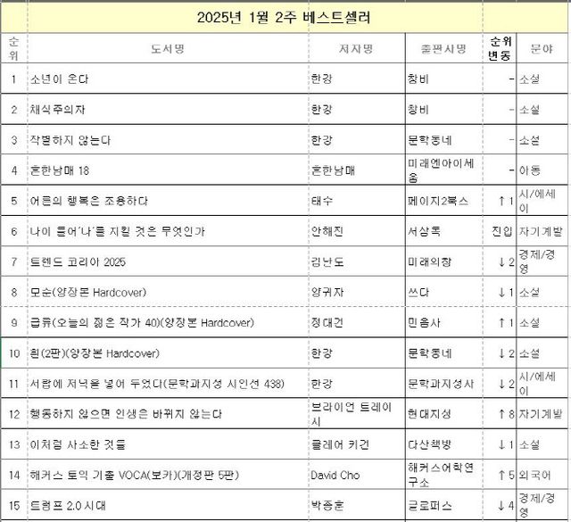17일 교보문고에 따르면 1월 둘째 주 종합 베스트셀러 집계 결과, 한강의 ‘소년이 온다’(창비)가 11주 연속 1위를 차지했다. 이어 지난주와 마찬가지로 ‘채식주의자’(창비)와 ‘작별하지 않는다’(문학동네)가 그 뒤를 따랐다.