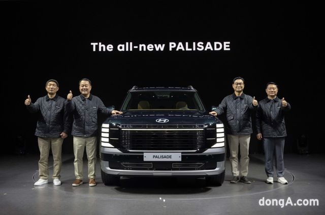 현대차 신형 팰리세이드 론칭 행사에서 이동석 현대차 대표이사 사장과 문용문 금속노조 현대자치부장 등 노사 대표가 기념사진을 촬영하고 있다. (왼쪽부터 문용문 금속노조 현대차지부장, 대표이사 이동석 사장, 국내사업본부장 정유석 부사장, 박성열 현대차지부 판매위원회 의장)