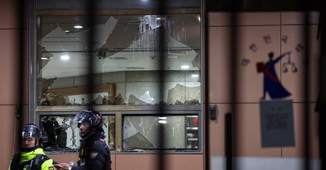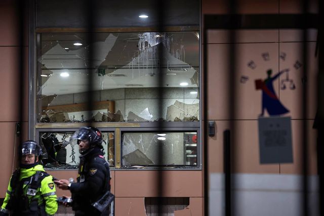 19일 새벽 서울 마포구 서울서부지방법원에 윤석열 대통령에 대한 구속영장 발부 소식에 격분한 윤 대통령 지지자들이 난입해 유리창과 법원 건물 벽면 등을 파손한 흔적이 남아 있다 / 뉴스1
