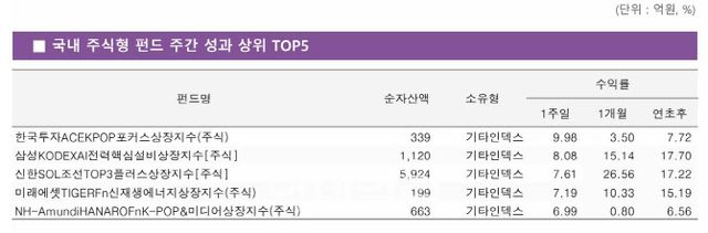 19일 펀드평가사 KG제로인에 따르면 순자산액(클래스 합산) 100억원 이상, 운용기간 1개월 이상인 국내 주식형 펀드 가운데 지난주(10~17일) 가장 높은 수익률을 기록한 상품은 한국투자신탁운용의 ‘ACE KPOP 포커스’ ETF다. 이 상품은 일주일간 9.98%의 수익률을 냈다.