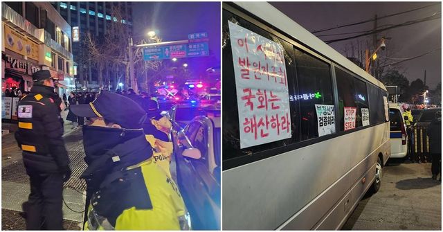 헌법재판소에서 안국역 2번 출구로 이동해 집회 중인 윤석열 대통령 지지자들(왼쪽)과 차벽에 손팻말 붙인 윤석열 대통령 지지자들 / 연합뉴스