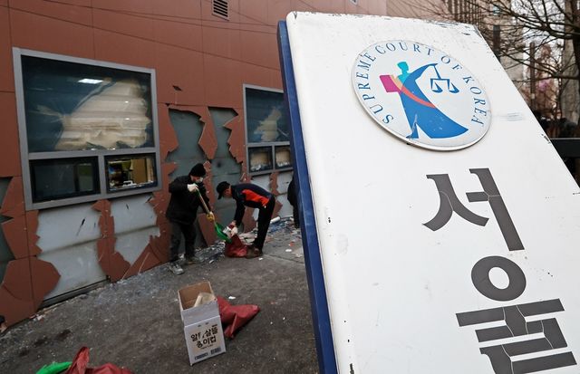 지난 19일 오후 윤석열 대통령 지지자들의 폭력 난입 사태가 발생한 서울 마포구 서울서부지방법원 후문의 기울어진 법원 현판 뒤에서 관계자들이 폐기물을 치우고 있다. / 뉴스1