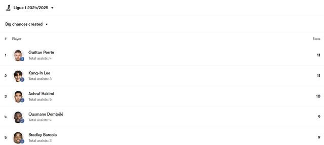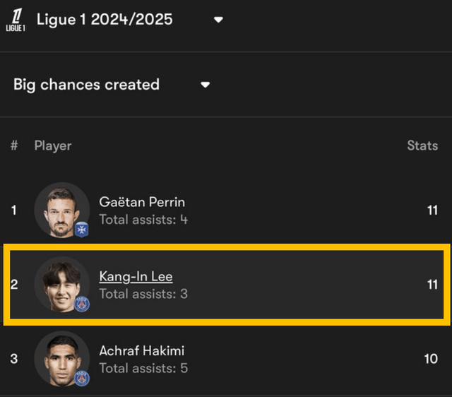 풋몹 통계에 따르면 이강인은 이번 시즌(2024-2025) 리그1에서 지금까지 총 11개의 기회를 창출해 가에탕 페랭과 함께 '빅 찬스 메이킹' 공동 1위에 올라있다.
