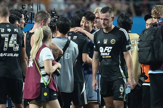 지난해 7월 31일 오후 서울 마포구 상암동 서울월드컵경기장에서 열린 쿠팡플레이 시리즈 1차전 토트넘 홋스퍼와 팀 K리그의 경기에서 4대3 승리를 거둔 토트넘 손흥민이 경기 후 팀 K리그 정호연과 인사를 나누고 있다 / 뉴스1