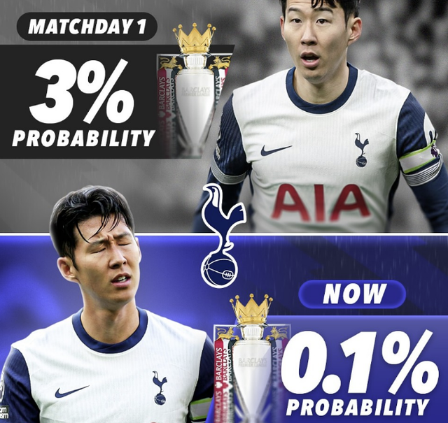 토트넘이 이번 시즌 프리미어리그를 우승할 확률은 0.1% 이하다. 반대로 강등 가능성이 더 현실적인 상황이다. 축구팬들은 토트넘이 이 부진에서 탈출할 수 있을지 끝까지 관심있게 지켜볼 것이다.