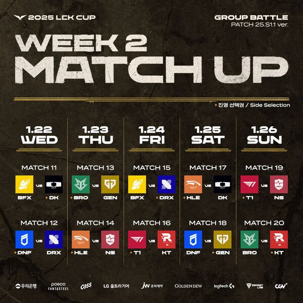 한편, 2025 LCK컵 2주 차는 SOOP, 네이버 이스포츠&게임, 유튜브 LCK 채널 등 온라인 플랫폼을 통해 생중계된다. 경기는 평일 오후 5시, 주말 오후 3시부터 시작되며 현장 관람 티켓 예매는 경기 시작 48시간 전부터 인터파크를 통해 가능하다.