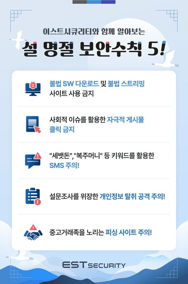 ㅣ데일리포스트=곽민구 기자ㅣ2025년 설 연휴가 코앞으로 다가왔다. 올해 설은 국내외적으로 사회적 혼란이 지속되며 우려와 기대가 혼재하고 있다. 혼란한 시기를 틈다 개인정보 탈취나 피싱 사기 등의 불법적 시도들도 더 많아질 것이라 예상되고 있다. 이에 보안전문기업 이스트시큐리티는 21일 설 연휴를 앞두고 안전한 명절을 보내기 위한 보안 수칙 5가지를 발표했다.