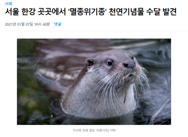 (각종 하천, 여의도, 한강등에서 수달이 계속 발견되고 있는 한국)