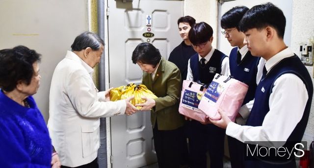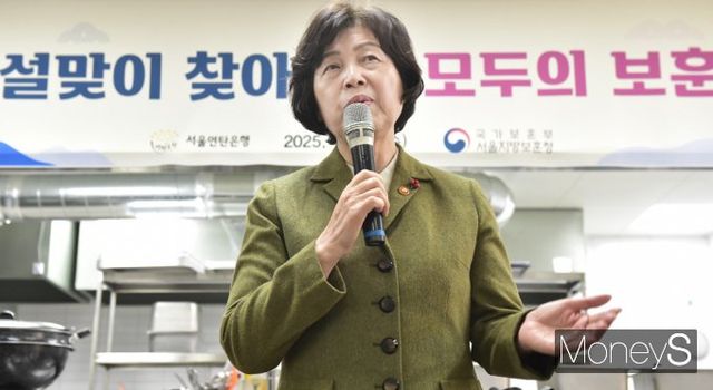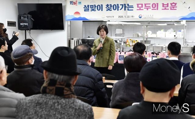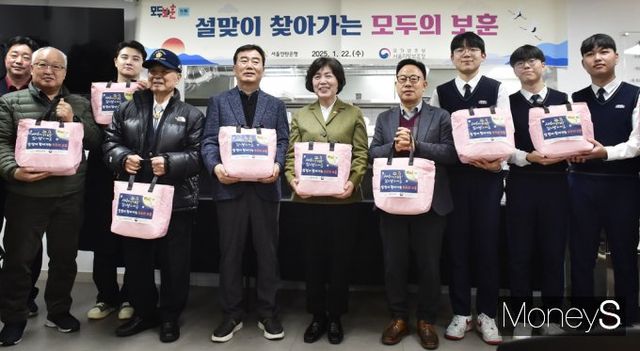 설 명절 연휴가 일주일 앞으로 다가온 가운데 강정애 국가보훈부 장관을 포함한 내외 인사들이 국가유공자를 대상으로 22일 서울 용산구 동자동 서울연탄은행에서 진행된 '설맞이 찾아가는 모두의 보훈' 위문 행사에 참석, 도시락을 들고 기념촬영을 갖고 있다.
