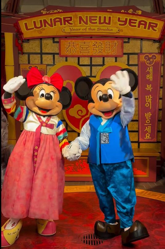 영상에는 ‘음력 설(Happy lunar new year)’이라는 문구와 함께 한국어·중국어·베트남어로 적은 새해 인사가 담겼다. 한국어로는 “새해 복 많이 받으세요”라고 쓰여 있다. 특히 이번 행사에서 미키 마우스·미니 마우스가 처음으로 한복을 입고 등장해 눈길을 끌었다.