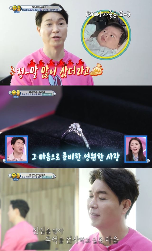 그런 가운데 이날 박수홍은 김다예를 위한 서프라이즈 이벤트를 준비해 감동ㅇ르 자아냈다. 그는 꽃을 들고 결혼식 당시 틀었던 노래를 부르며 리마인드 프러포즈를 해 눈길을 끌었다.