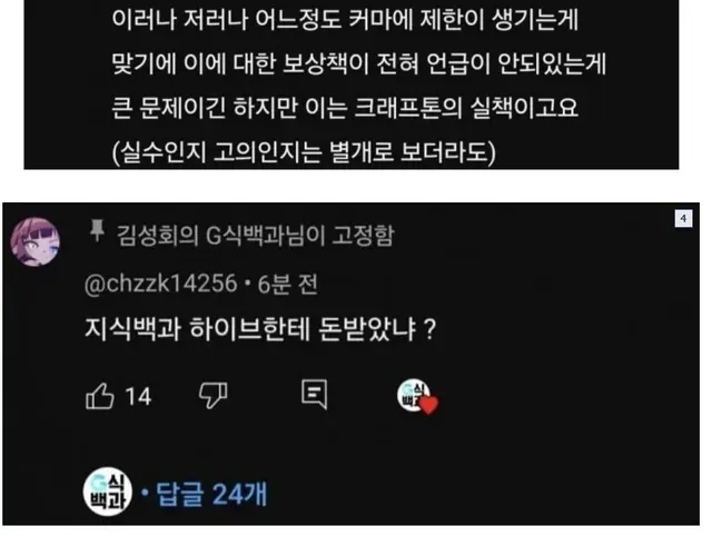 김성회도 빡쳐서 지식백과 하이브한테 돈받았냐? 를 고정댓글로 해둠